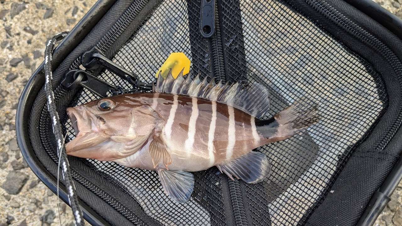 コマセを足元に撒きつつ、胴突きで足元を探っていると、2時間で、ベラ、ベラ、ベラ、マハタ?、ベラ、アラカブ、ベラ、サバゴ、ネンブツダイが釣れました。全部10〜15cmくらいなのでリリースしました。