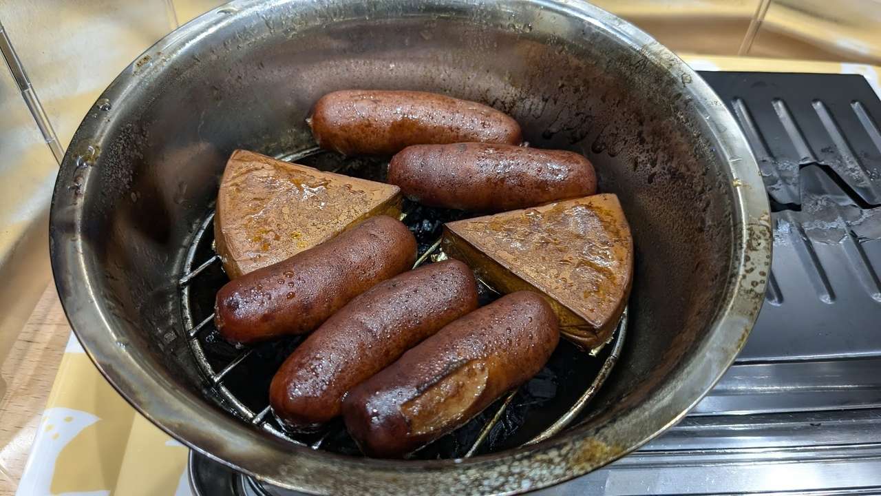 本日もおうちキャンプ飯です。今日はソーセージとチーズの燻製と白ご飯というメニューです。